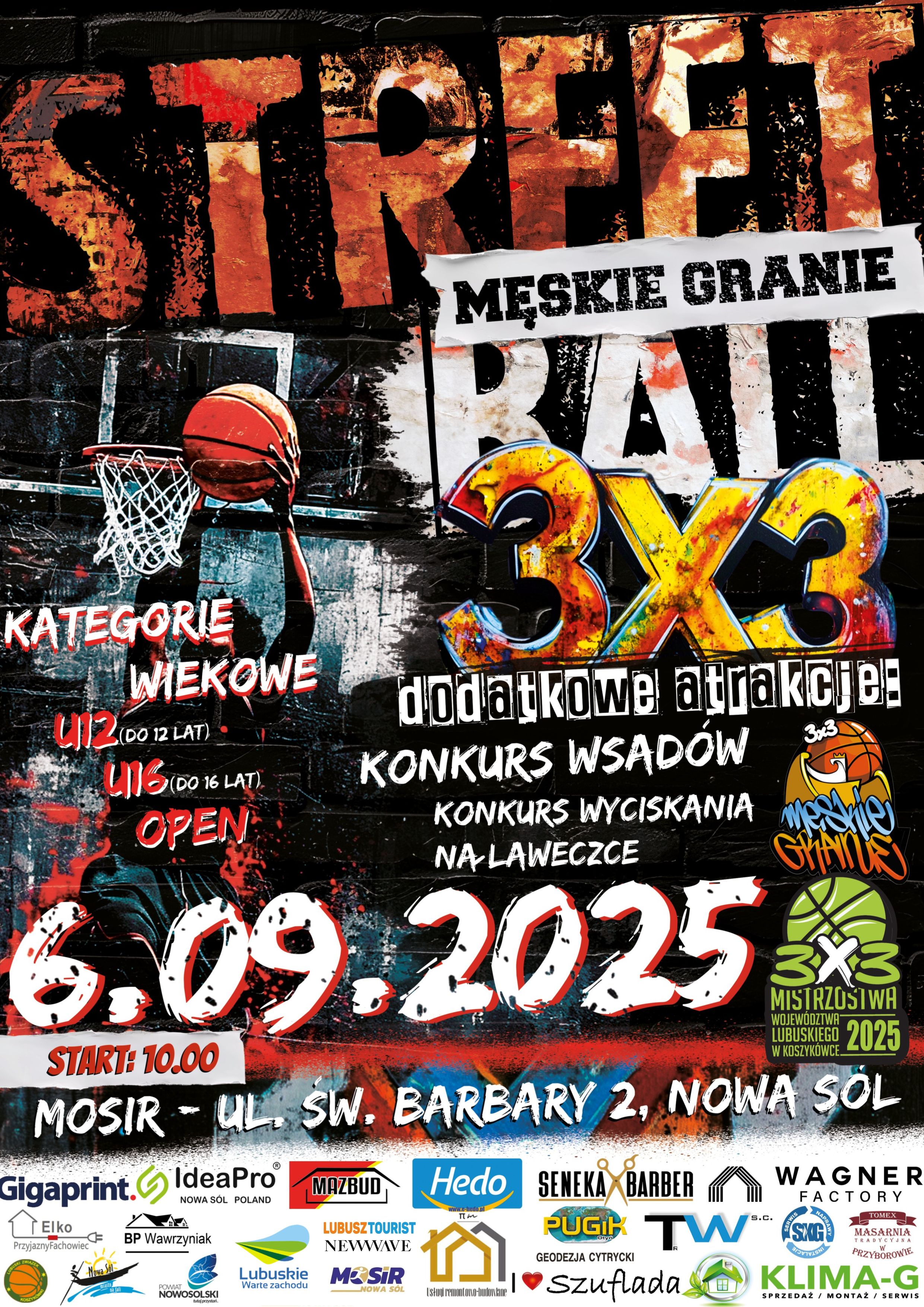 Najważniejsza impreza w regionie w koszykówce 3x3 przed nami! Męskie Granie 3x3 Streetball zaprasza do Nowej Soli w sobotę 6 września 2025 r. W ramach turnieju rozstrzygnie się kto zgarnie tytuł Mistrza Województwa Lubuskiego 3x3! Poprzednie turnieje cieszyły się bardzo dużym zainteresowaniem więc warto szybciej dokonać zgłoszenia.